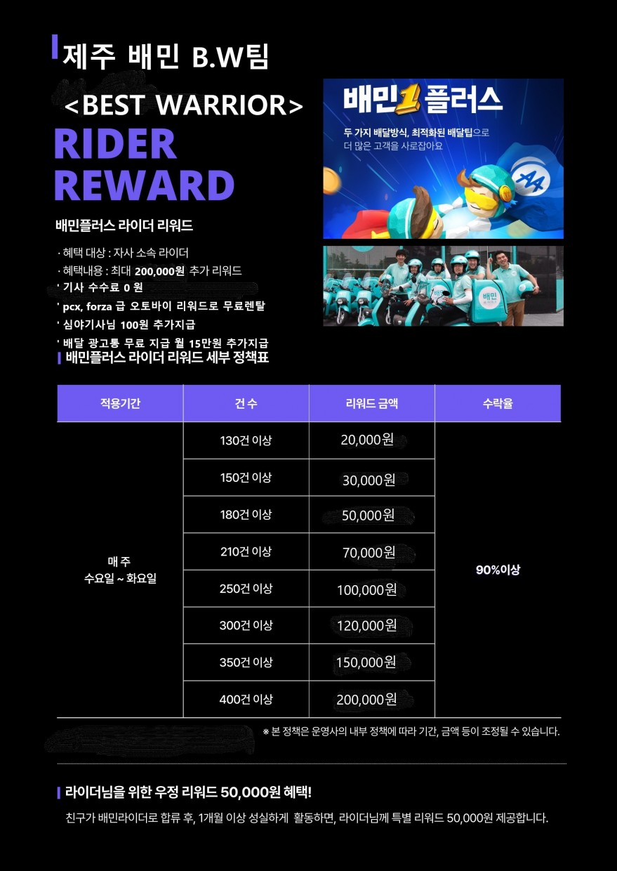 배민+BW팀 라이더 모집 심야자체할증! 일주일 개인 20만원 리워드지급! 오토바무료렌탈!!