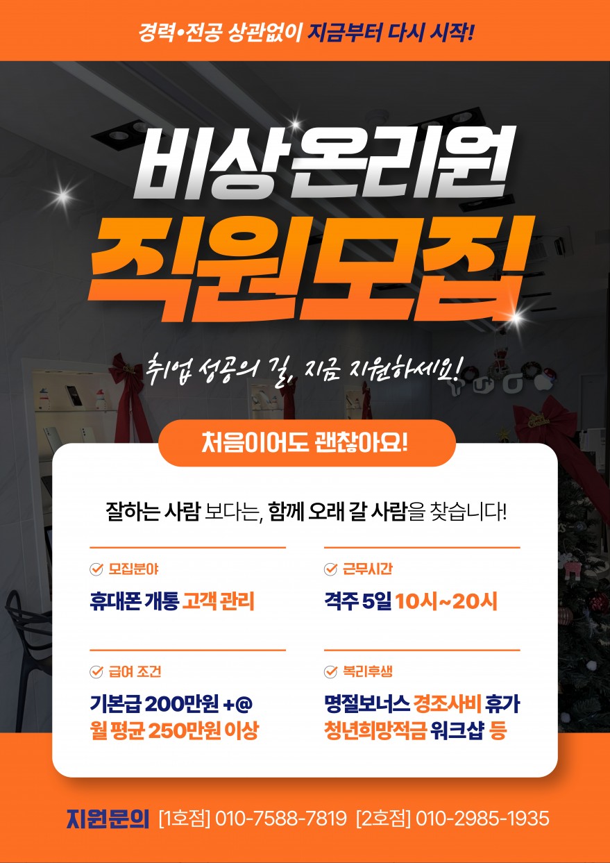 휴대폰매장⭐️월평균250~350만원⭐️초보자가능^^ 페이지 정보 작성자 aOOOOO2 작성일25-12-29 08:55 조회95회 연락처 010-7588-7819 급여 월급 : 250만원 이상 관련링크 본문 - 주소 : 제주 제주시 월랑로 8길 1 이전글 다음글 목록