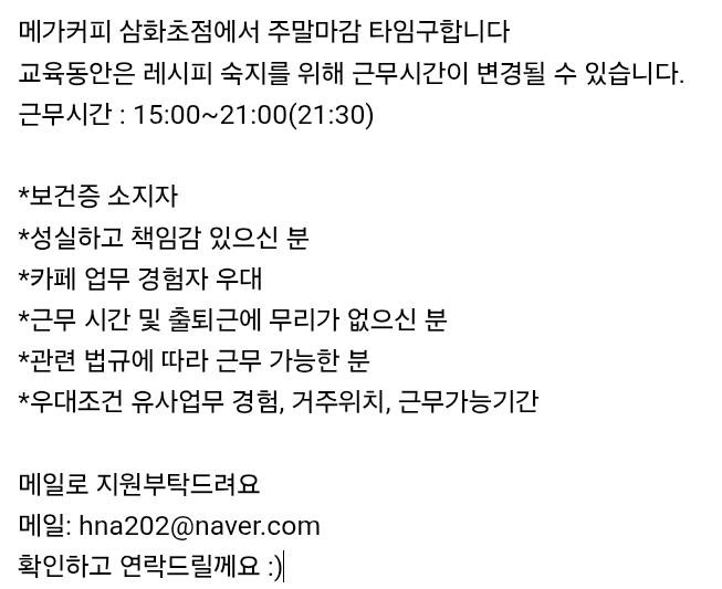 메가삼화초점주말마감모집합니다 페이지 정보 작성자 돌굴 작성일25-12-29 11:09 조회162회 연락처 010-7170-3336 급여 시급 : 10030 관련링크 본문 메가삼화초점주말마감모집합니다. 주소 : 제주시 화삼로19 삼화빌딩 1층 메가커피 삼화초점 이전글 다음글 목록