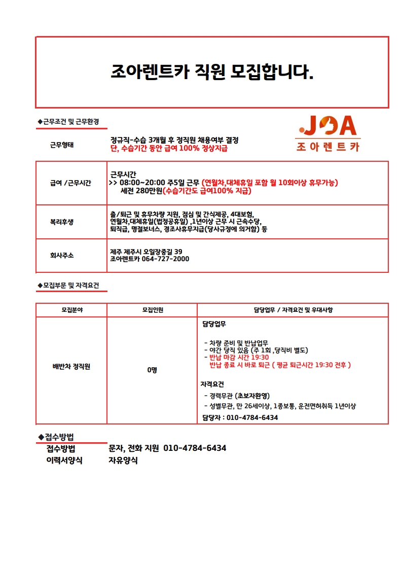 ✧*.◟(ˊᗨˋ)◞.*✧ 조아렌트카 / 출퇴근,휴무차량지원 / 배차 정직원 페이지 정보 작성자 쎄OO어 작성일25-10-09 17:13 조회236회 연락처 010-4784-6434 급여 월급 : 280만원 관련링크 본문 주소 : 제주특별자치도 제주시 오일장중길 39 조아렌트카 이전글 다음글 목록