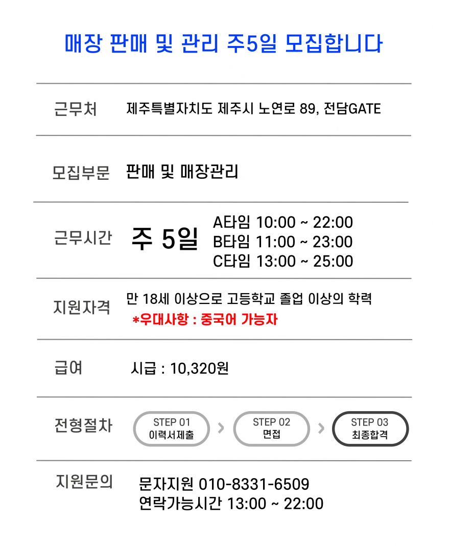 ★★★세상에서 제일 쉬운 판매직 직원을 모집합니다★★★ 페이지 정보 작성자 곽O식 작성일25-12-12 19:46 조회130회 연락처 010-8331-6509 급여 시급 : 10,320 관련링크 본문 ■ 주업무 : 고객이 물건 선택하면 결제 후 봉투에 담아드리기.외워야 할 내용 거의 없음.■ 근무지 : 연동 주소 : 제주특별자치도 제주시 노연로 89 1층 전담GATE 이전글 다음글 목록