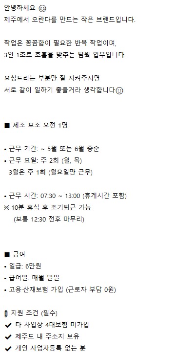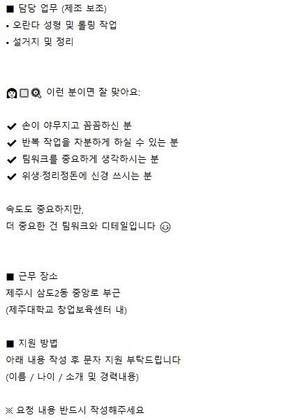■(평일오전) 과자 제조 보조 구함■ 페이지 정보 작성자 단OOO심 작성일26-03-18 13:08 조회201회 연락처 010-2977-8895 급여 일당 : 60000 관련링크 본문 과자 제조보조 여 1명 주소 : 제주특별자치도 제주시 중앙로14길 21 이전글 다음글 목록