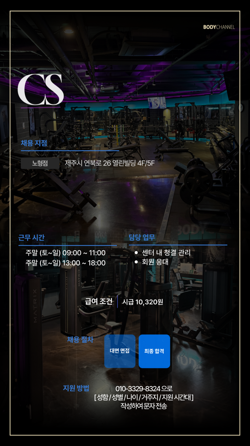 바디채널 제주시청점, 노형점에서 FC / CS 를 맡아주실 직원분들을 구인합니다.