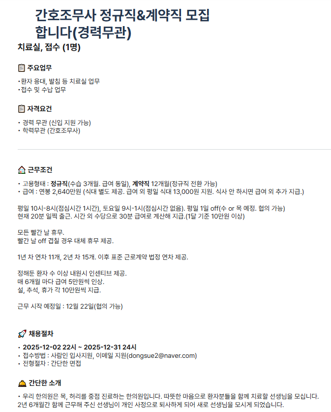 제주 이도한의원 간호조무사 선생님 모십니다. 페이지 정보 작성자 이O이 작성일25-12-09 15:59 조회162회 연락처 010-5604-0509 급여 월급 : 2200000 관련링크 본문 안녕하세요. 제주 이도한의원에서 간호조무사 선생님을 모십니다. 주소 : 제주특별자치도 제주시 승천로 81 2층 이전글 다음글 목록