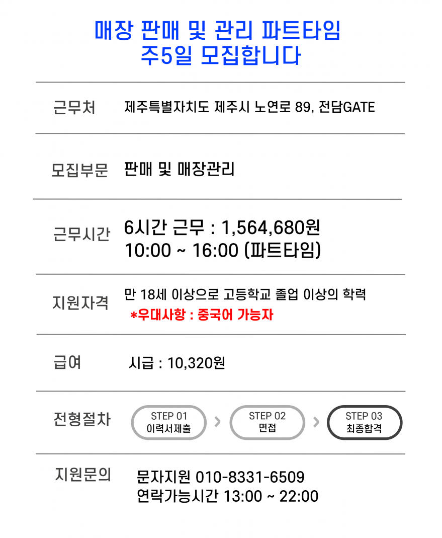 ★★★세상에서 제일 쉬운 파트타임 직원을 모집합니다★★★ 페이지 정보 작성자 전담 작성일25-12-08 18:01 조회203회 연락처 010-8331-6509 급여 시급 : 10,320 관련링크 본문 ■ 주업무 : 고객이 물건 선택하면 결제 후 봉투에 담아드리기.외워야 할 내용 거의 없음.■ 근무지 : 연동 주소 : 제주특별자치도 제주시 노연로 89 1층 전담GATE 이전글 다음글 목록