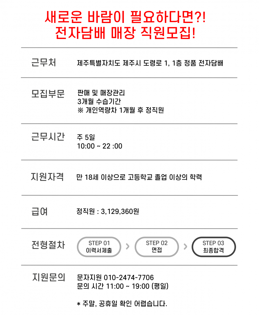 ♥︎♥︎새로운 바람이 필요하다면?! 전자담배 매장 직원모집!♥︎♥︎ 페이지 정보 작성자 아OOO우 작성일25-12-08 18:04 조회213회 연락처 010-2474-7706 급여 월급 : 3,129,360 관련링크 본문 부재 시 문자로 이력서 보내주세요부재 시 문자로 이력서 보내주세요 주소 : 제주특별자치도 제주시 도령로 1 1층 전자담배매장 이전글 다음글 목록