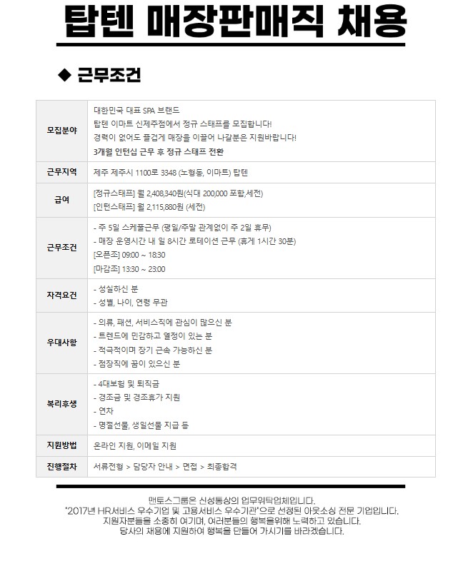 **탑텐 이마트 신제주점 정규 구인합니다 **