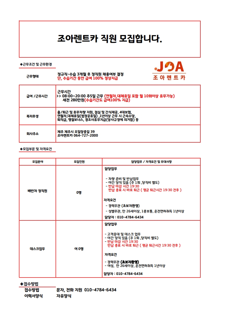 ( ღ'ᴗ'ღ )( ღ'ᴗ'ღ ) 조아렌트카 출퇴근차량지원 / 데스크배차 정직원 페이지 정보 작성자 jOOOOOt 작성일25-10-01 13:13 조회357회 연락처 010-4784-6434 급여 월급 : 280만원 관련링크 본문 주소 : 제주특별자치도 제주시 오일장중길 39 조아렌트카 이전글 다음글 목록