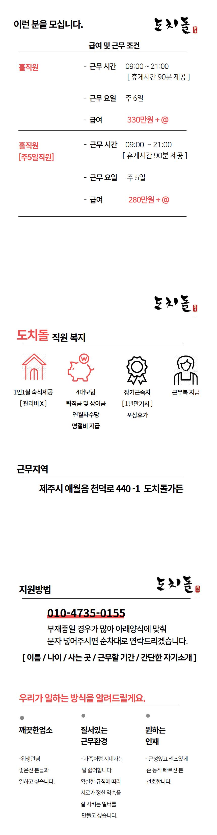 [숙식제공/1인1실]_280,330만원_홀직원_모집 페이지 정보 작성자 gOOOOOOOOO8 작성일25-09-29 08:32 조회508회 연락처 010-4735-0155 급여 월급 : 330만원 관련링크 본문 . 주소 : 천덕로440-1 이전글 다음글 목록
