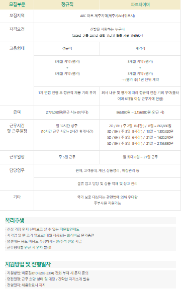 ABC마트 ST 제주칠성점 판매사원 정규직/파트타이머 모집(식대지원) 페이지 정보 작성자 eOOOOOOn 작성일26-03-08 09:53 조회127회 연락처 010-8283-2394 급여 월급 : 2,776,080 관련링크 본문 . 주소 : 제주특별자치도 제주시 중앙로5길 6 제주코리아극장 ABC마트 ST 제주칠성점 이전글 다음글 목록