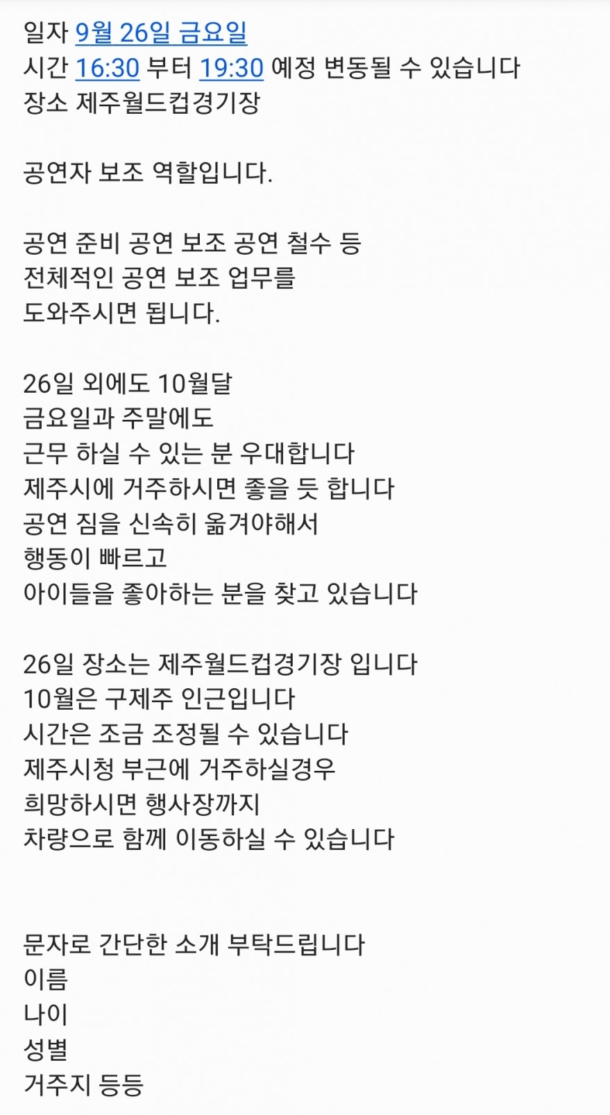 축제행사공연보조구합니다 페이지 정보 작성자 프O르 작성일25-09-24 19:34 조회812회 연락처 010-8180-2369 급여 시급 : 12000 관련링크 본문 000 주소 : 제주특별자치도 제주시 광양9길 10 제주시청 이전글 다음글 목록