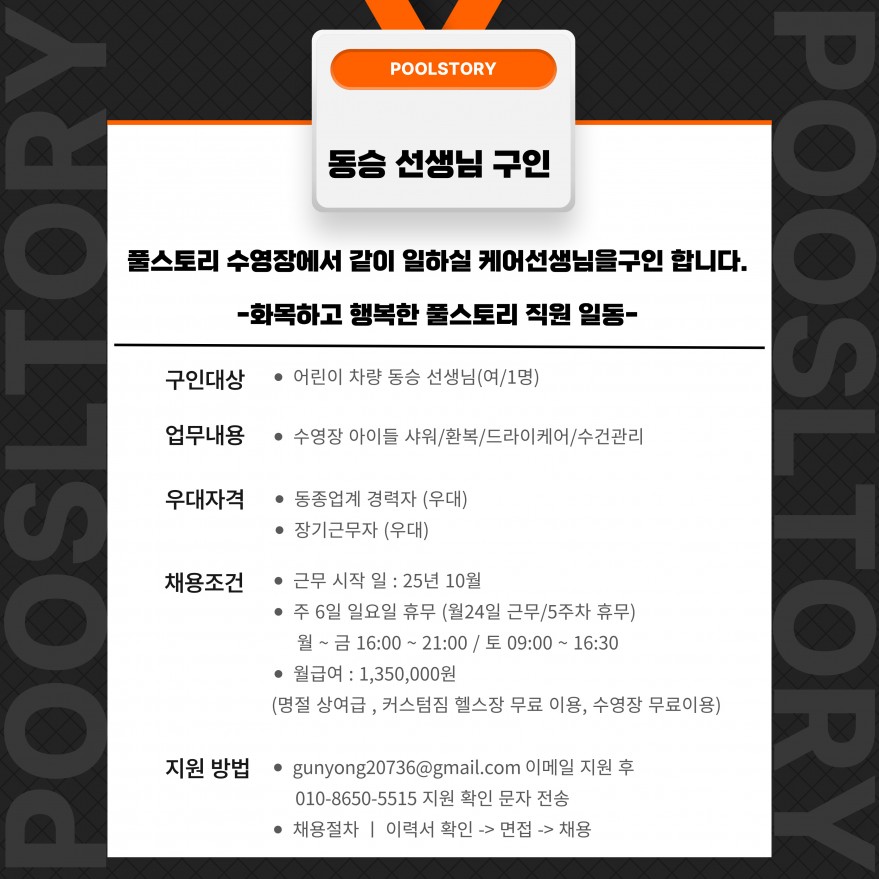 수영장 차량 동승/케어 선생님 구인 페이지 정보 작성자 pOOOOOOOy 작성일25-09-24 11:55 조회608회 연락처 010-8650-5515 급여 월급 : 1350000 관련링크 본문 풀스토리 수영장 차량 동승 케어 선생님 구인 근무시간 사진 참조 많은 관심 부탁드립니다^^ 주소 : 제주특별자치도 제주시 연사6길 57 지하1층 풀스토리수영장 이전글 다음글 목록