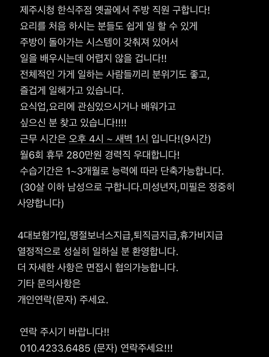 제주시청한식주점옛골에서주방직원구해요! 페이지 정보 작성자 꼬동 작성일25-09-22 18:10 조회510회 연락처 010-4233-6485 급여 월급 : 2800000 관련링크 본문 . 주소 : 제주시 광양8길 1-6 2층 옛골 이전글 다음글 목록