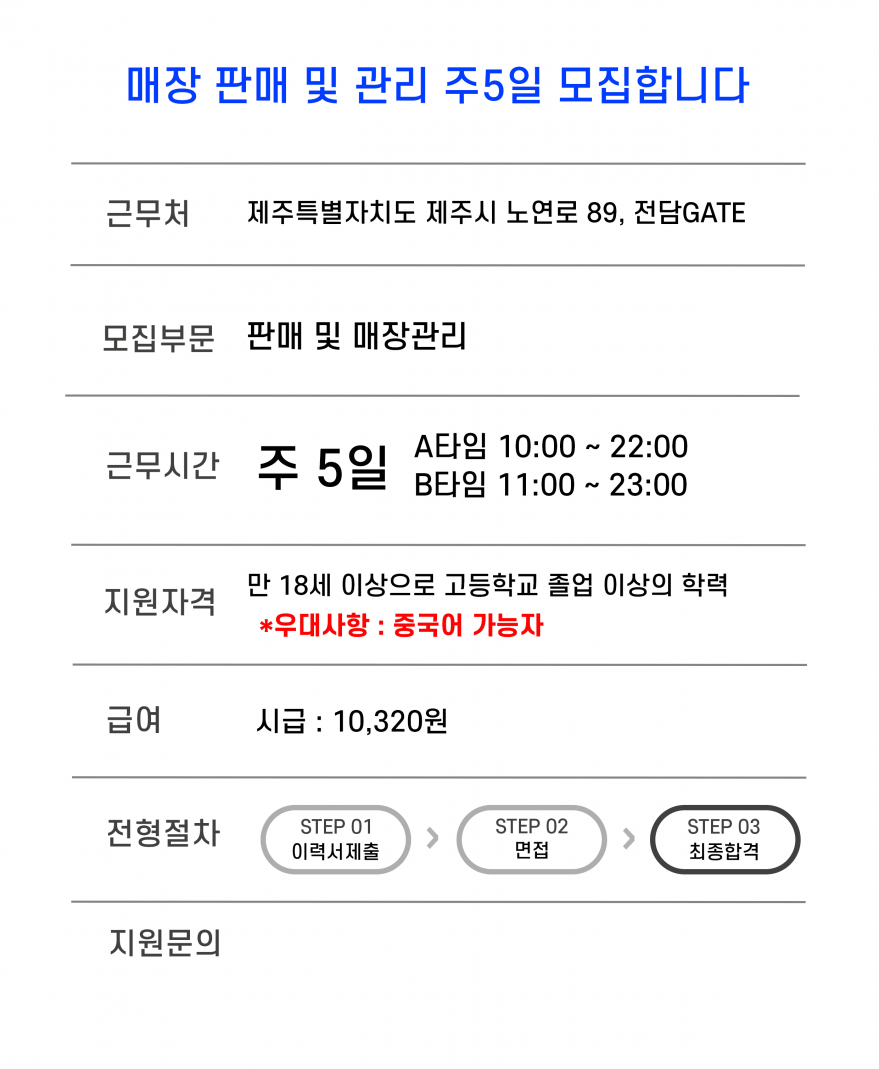 ★★★세상에서 제일 쉬운 판매직 직원을 모집합니다★★★ 페이지 정보 작성자 곽O식 작성일25-12-04 17:48 조회290회 연락처 010-8331-6509 급여 시급 : 10,320 관련링크 본문 ■ 주업무 : 고객이 물건 선택하면 결제 후 봉투에 담아드리기.외워야 할 내용 거의 없음.■ 근무지 : 연동 주소 : 제주특별자치도 제주시 노연로 89 1층 전담GATE 이전글 다음글 목록