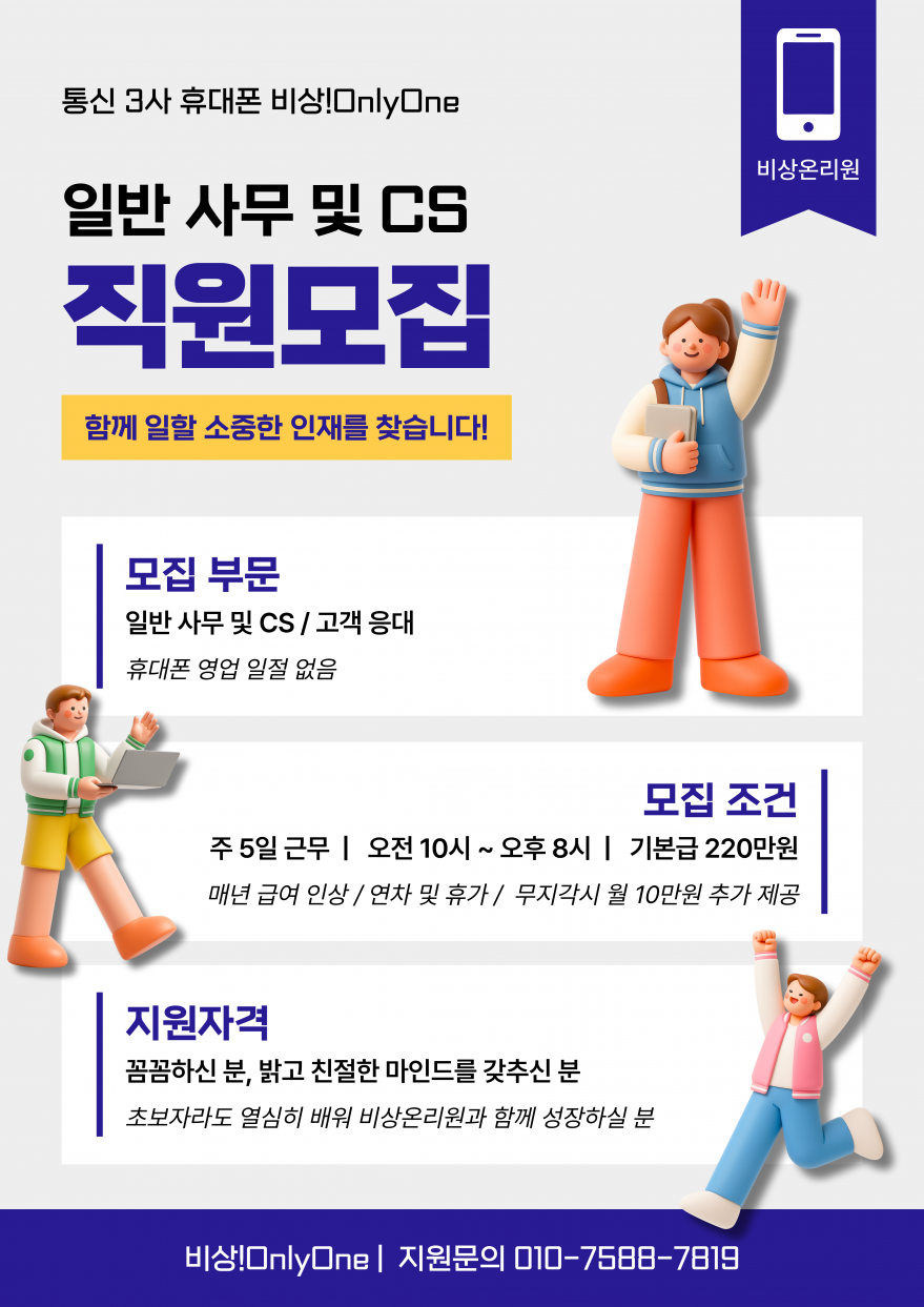 휴대폰매장(노형점)⭐️CS경리여성분⭐️모십니다^^ 페이지 정보 작성자 아O라 작성일26-01-15 10:52 조회310회 연락처 010-7588-7819 급여 월급 : 220만원 관련링크 본문 - 주소 : 제주 제주시 월랑로 8길 1 이전글 다음글 목록