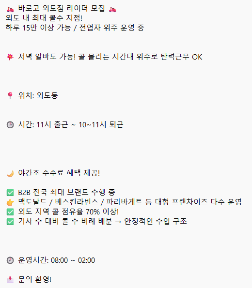 배달대행 바로고 외도점에서 기사님구합니다 페이지 정보 작성자 외OOO고 작성일25-10-19 14:50 조회267회 연락처 010-2290-1870 급여 일당 : 150000 관련링크 본문 주소 : 제주특별자치도 제주시 우정로4길 29 이전글 다음글 목록
