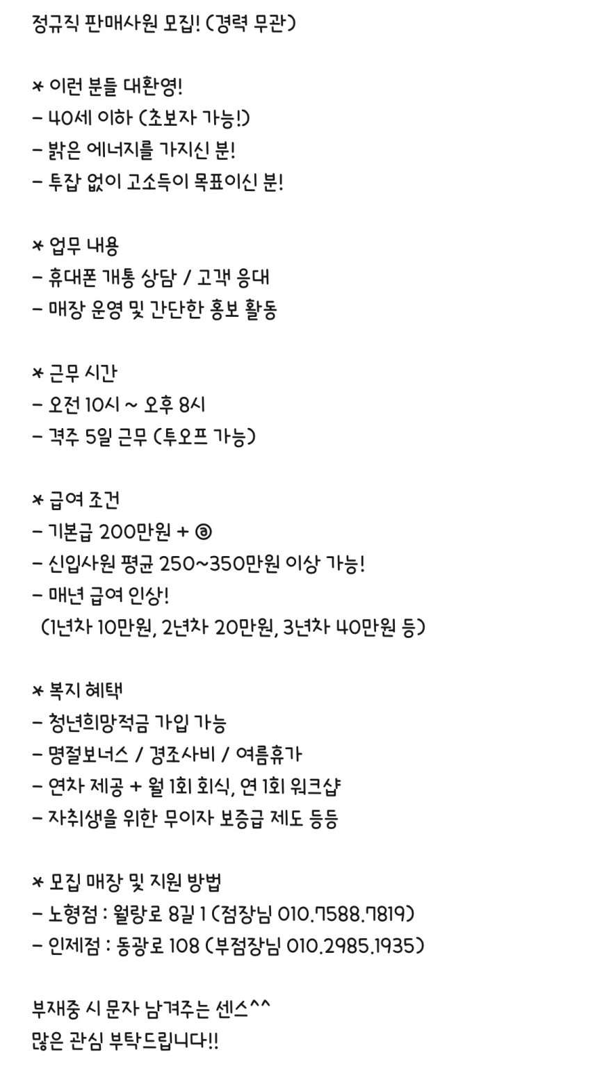 휴대폰매장⭐️비상!OnlyOne⭐️직원모집!초보자가능^^ 페이지 정보 작성자 아O라 작성일25-12-16 16:38 조회26회 연락처 010-7588-7819 급여 월급 : 250만원 이상ㅎ 관련링크 본문 - 주소 : 제주 제주시 월랑로 8길 1 이전글 다음글 목록