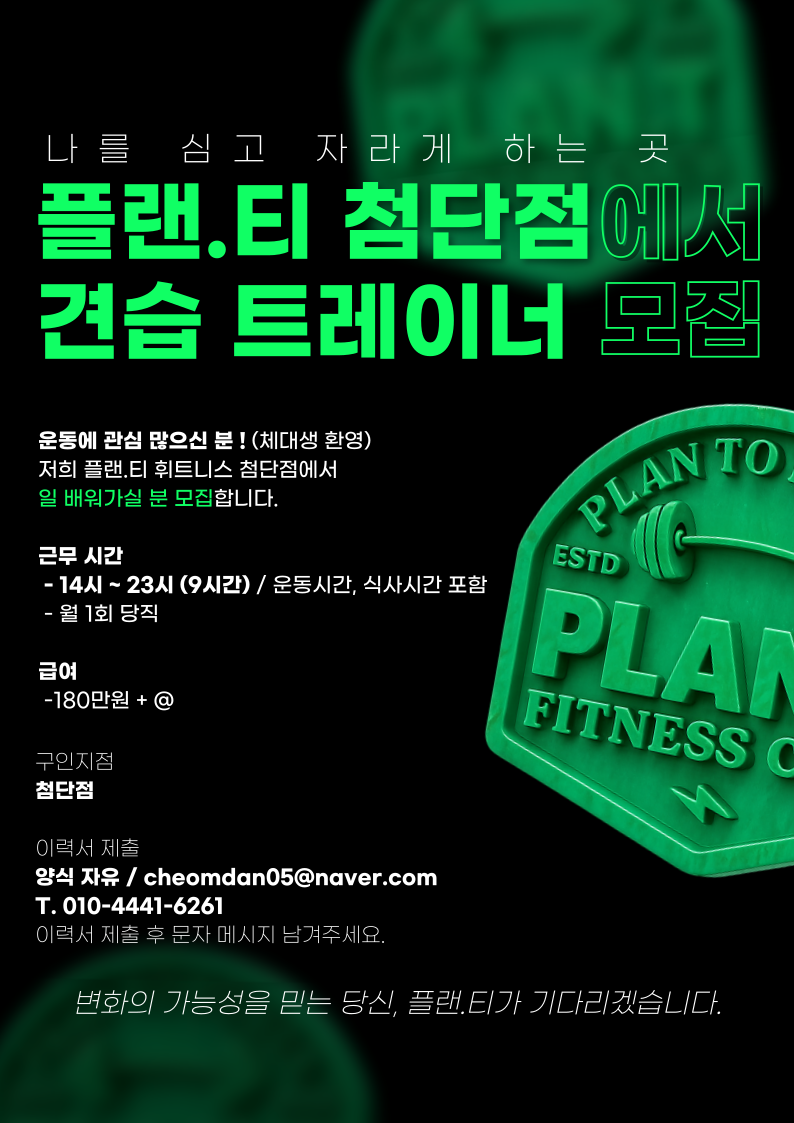 플랜티 휘트니스 첨단점에서 견습 트레이너 모집합니다