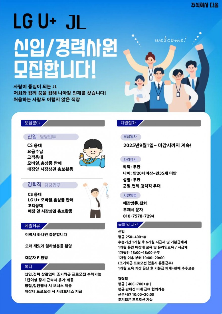 JL 에서 신입직원 및 경력자 구합니다!! 페이지 정보 작성자 제OOOO니 작성일25-11-26 12:13 조회569회 연락처 010-7578-7294 급여 월급 : 350만+@ 관련링크 본문 주소 : 제주특별자치도 제주시 중앙로 76 1층 엘지유플러스 이전글 다음글 목록