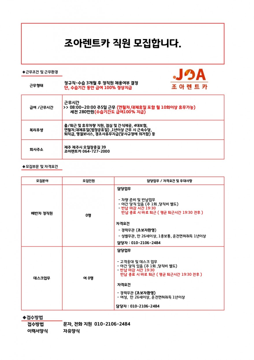⭐⭐໒(◉ᴥ◉)७조아렌트카 / 출퇴근휴무차량지원 / 데스크배차 페이지 정보 작성자 jOOOOa 작성일25-11-23 12:41 조회544회 연락처 010-2106-2484 급여 월급 : 280만원 관련링크 본문 주소 : 제주특별자치도 제주시 오일장중길 39 조아렌트카 이전글 다음글 목록