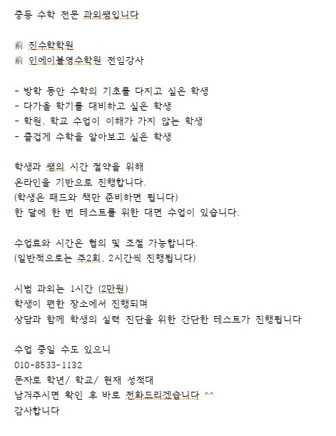 중등수학과외합니다 페이지 정보 작성자 hOOOOOOOl 작성일26-01-03 20:13 조회543회 연락처 010-0000-0000 급여 협의 : 99999 관련링크 본문 . 주소 : 제주특별자치도 제주시 화삼북로 90 제주삼화사랑으로부영7차 이전글 다음글 목록