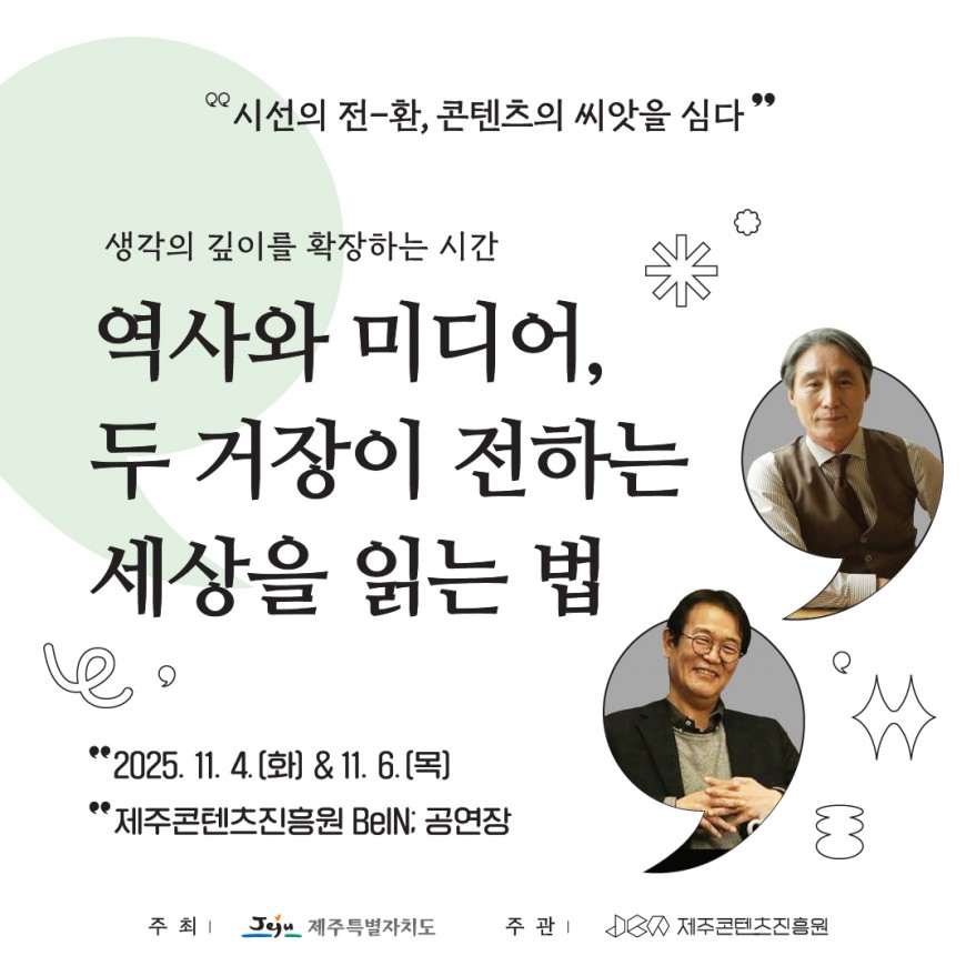 [제주콘텐츠진흥원]역사와미디어,두거장이전하는세상읽는법!(~11/5,수) 페이지 정보 작성자 함OO면 작성일25-10-24 12:37 조회1,145회 연락처 010-1234-5678 관련링크 본문 신청바로가기 자세히보기 이전글 다음글 목록